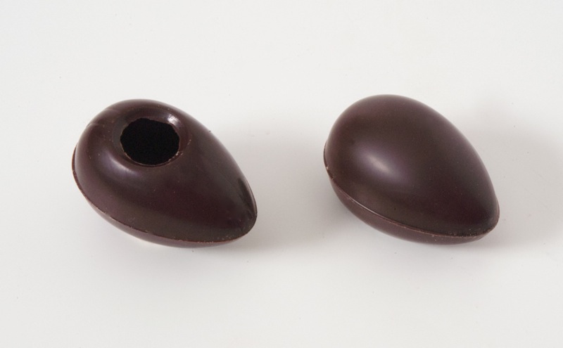Sehr guter Geschmack, dünne Wand und leicht zum Füllen. Ganache einfüllen, verschließen und mit Kuvertüre überziehen.