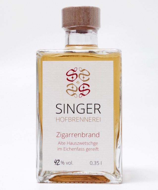 Die Zwetschen für diesen edlen Brand kommen vom eigenen Hof der Brennerei Singer am Simssee. Dieser Alte Hauszwetschge / Zigarrenbrand reift und lagert in einem Irischen Whiskyfass bevor dieser Brand in Flaschen abgefüllt wird. Dadurch entsteht ein typisches, rauchiges Aroma gepaart mit den reifen Zwetschgen, ein kulinarisches Erlebnis für jeden Genießer. Der zigarrige aber doch fruchtige Geschmack ist sehr elegant im Abgang, weich und hocharomatisch. Im Geruch ergibt sich ein whiskyartiges, fruchtreiches, blumig duftendes Aroma.
