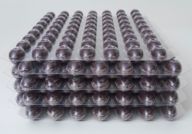 Sehr guter Geschmack, dünne Wand und leicht zum Füllen. Ganache einfüllen, verschließen und mit Kuvertüre überziehen.